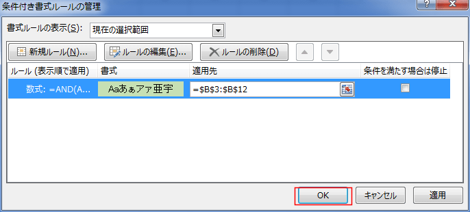 よって、数式はこれらすべてを AND関数を使って一つの条件としています。