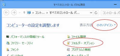 - 表示方法で[小さいアイコン]を選択して、[フォルダーオプション]をタップします。