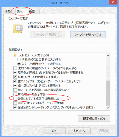 - [表示]タブをタップして選択し、「登録されている拡張子は表示しない」のチェックを外します。