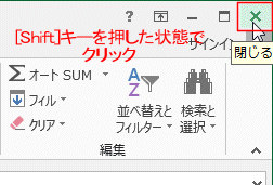 - [Shift]キーを押した状態で、【閉じる】ボタンをクリックすると、Excel2013自体を終了することができます。