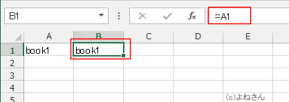 - Book1のA1セルに「book1」と入力、B1セルに「=A1」と入力しています。