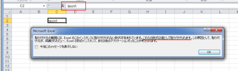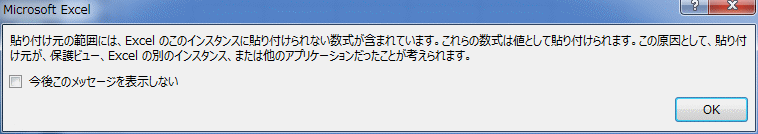 - ちなみに、Excel2010を2回起動して、2つのインスタンスとして開いた場合は、下図のようなメッセージが表示されセルの数式ではなく値が貼り付けられます。