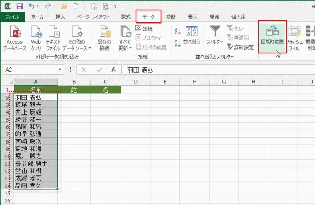 よねさんのExcelとWordの使い方|エクセル2013基本講座:目次|セルの操作|データ/数式/関数の入力|区切り位置でデータを区切る