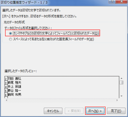 「カンマやタブなどの区切り文字によってフィールドごとに区切られたデータ」にチェックが入っているのを確認して、[次へ]ボタンをクリックします。