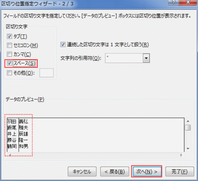 「スペース」にチェックを入れて、[次へ]ボタンをクリックします。