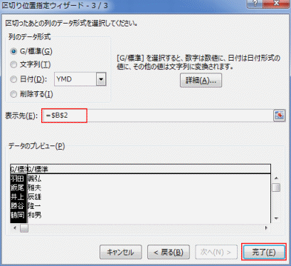 - 区切り位置指定ウィザード - 3/3 が開きました。