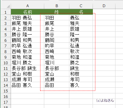 - 下図のような氏名が入力されたリストがあります。(姓と名がスペースで区切られています。)