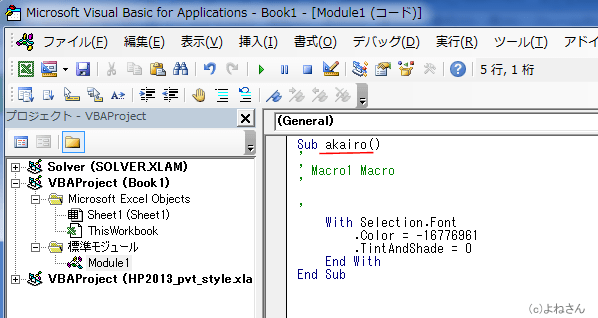 標準モジュールに記録されました。コード名を「akairo」としています。