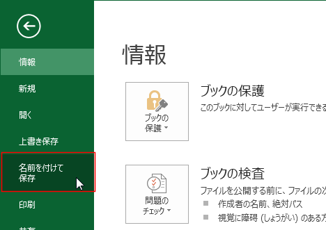 ファイルタブをクリックして、[名前を付けて保存]を実行します。