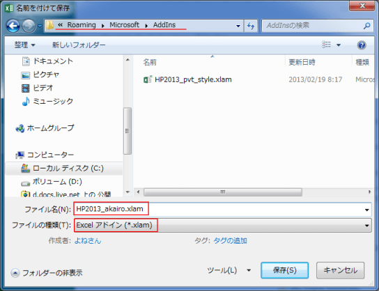 - ファイルの種類で「Excelアドイン(*.xlam)」を選択します。