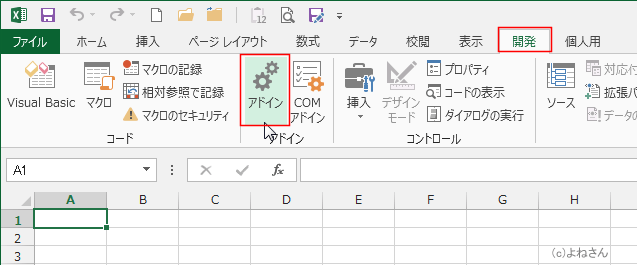 - [開発]タブをクリックして、[アドイン]を実行します。