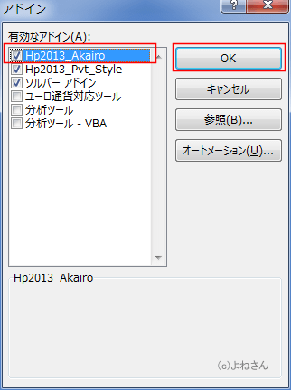 - 先ほど保存したアドイン(ファイル名HP2013_akairo.xlamとしています)にチェックを入れ、[OK]ボタンをクリックします。