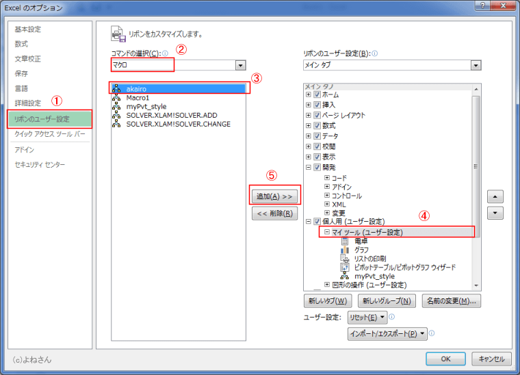 よねさんのExcelとWordの使い方|エクセル2013基本講座:目次|フォーム・ActiveX・マクロ(VBA)|自作のマクロをリボンに登録する