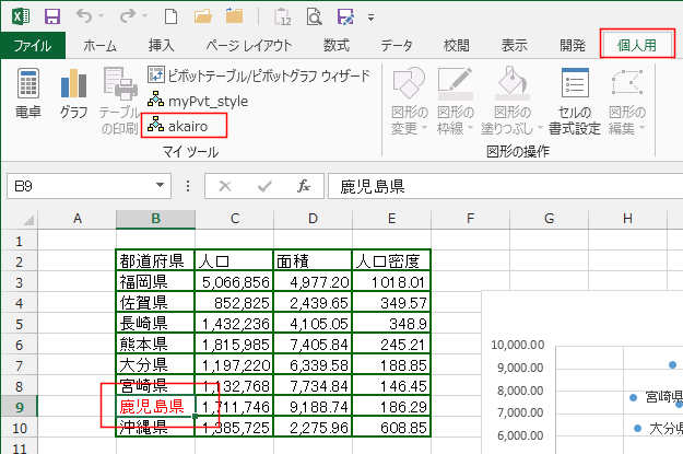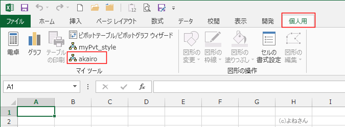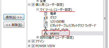 - [OK]ボタンをクリックして設定を反映すると、[個人用]タブの[マイツール]グループに「akairo」が作成されたのが確認できました。