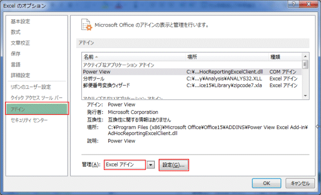 - [アドイン]を選択し、[管理]ボックスに[Excelアドイン]となっているのを確認して、隣の[設定]ボタンをクリックします。