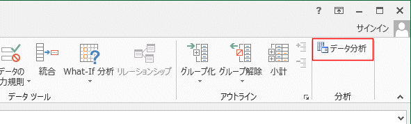 - [データ]タブの[分析]グループに[データ分析]が表示されます。