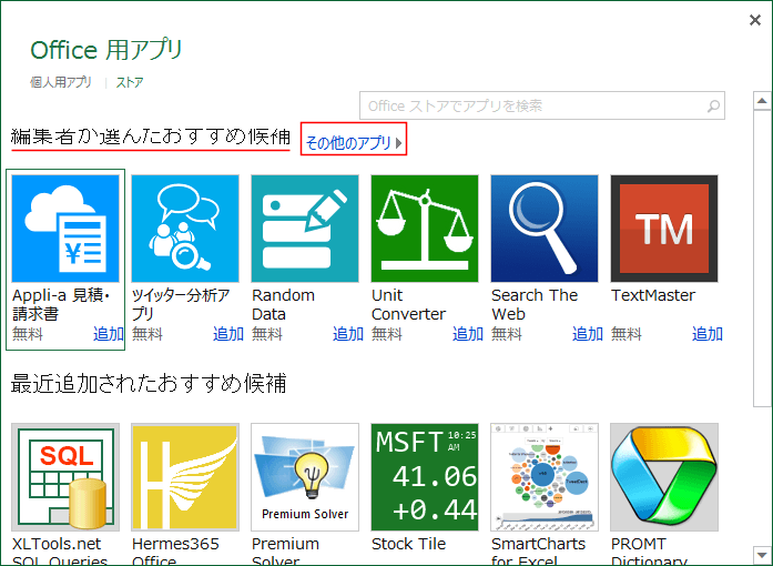 他のアプリを捜すには「ストア」をクリックします。または、下部の「Officeストアでその他のアプリを検索」をクリックします。
