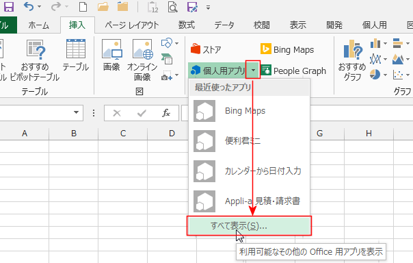 - [挿入]タブの[Office用アプリ]→[すべて表示]を選択しました。