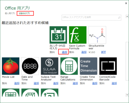 - 再度、Excel2013を起動して、[挿入]タブの[Office アプリ]をクリックすると、先ほど追加したものが表示されました。