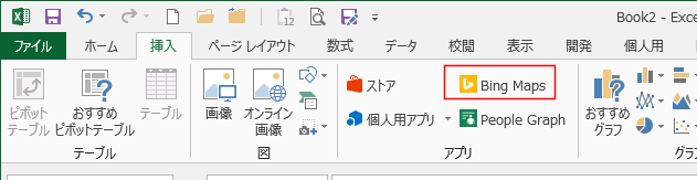 [挿入]タブのアプリグループに「Bing Maps]が表示されています。このボタンをクリックします。