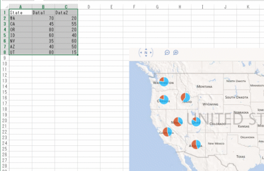 - シートにデータが入力され、地図に円グラフが表示されました。
