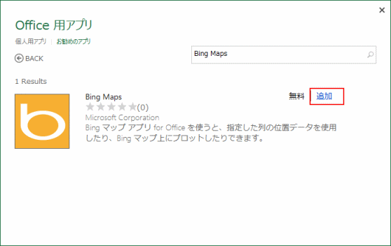 「BingMaps」が検索されました。[追加]をクリックします。