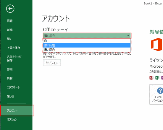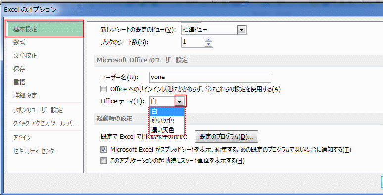 「Officeテーマ」で選択します。白、薄い灰色、濃い灰色の選択ができます。