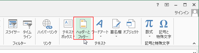 - [挿入]タブの[テキスト]グループにある[ヘッダーとフッター]を実行します。