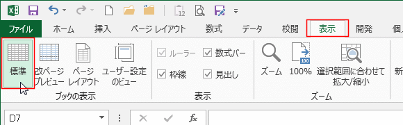 - [表示]タブの「ブックの表示」グループにある[標準]をクリックします。