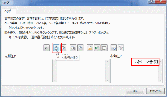 ヘッダーの右側のボックスには &[ページ番号] と入力されました。