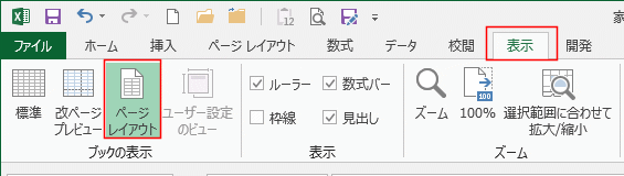- [表示]タブの「ブックの表示」グループにある[ページレイアウト]をクリックします。