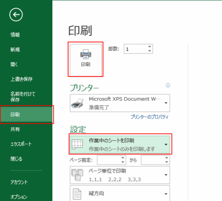 設定で[作業中のシートを印刷]を選択します。