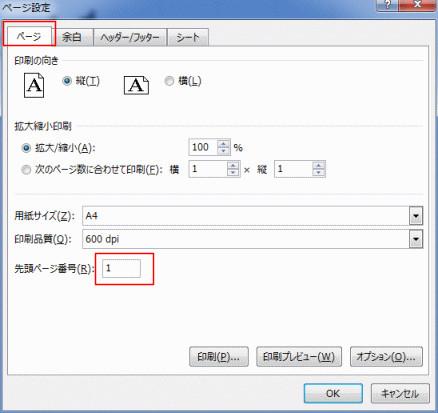 [ページ]タブを選択して、先頭のページ番号に「1」と入力します。