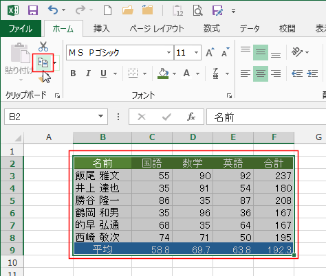 - セル範囲を選択して、[ホーム]タブの[コピー]を実行します。