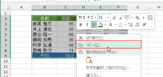- セル範囲を選択して、選択範囲を右クリックして、[コピー]を実行します。