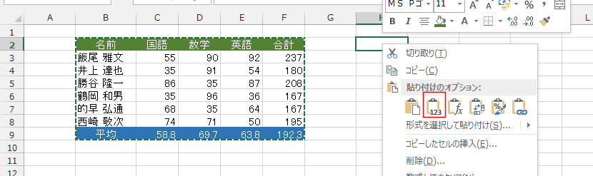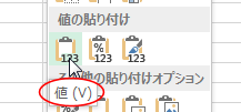 - 貼り付け先のセルを右クリックして、貼り付けオプションの[値]を実行します。