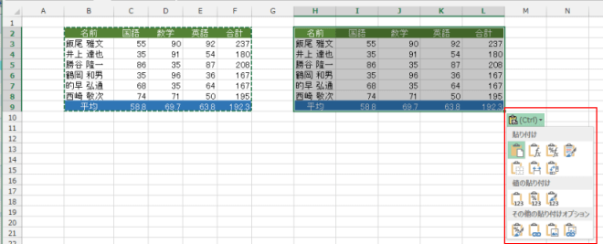 貼り付けオプションが表示されますので、[Ctrl]キーを押して貼り付けオプションを開きます。