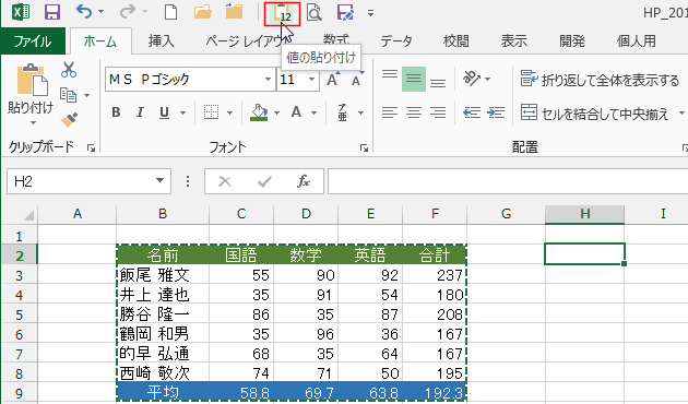- 貼り付け先のセルを選択して、クイックアクセスツールバーに登録した「値の貼り付け」を実行します。