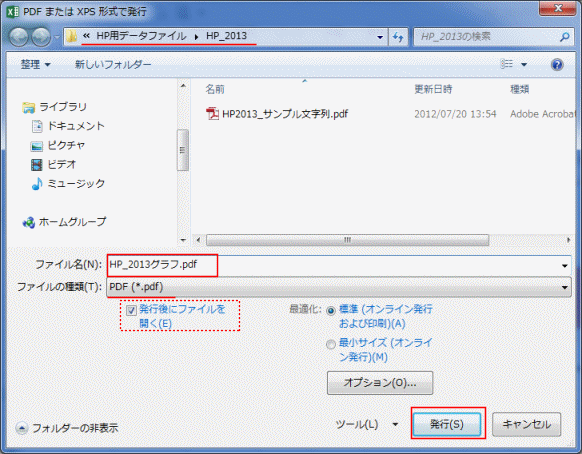 「発行後にファイルを開く」にチェックが入っているのを確認します。