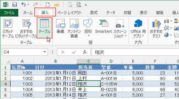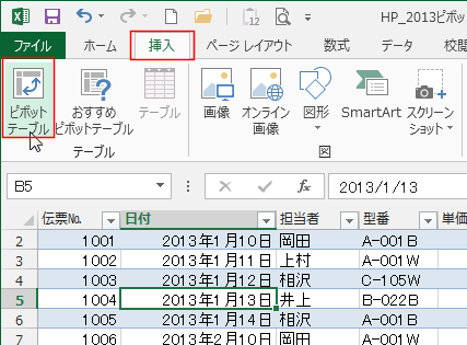 - テーブル内のセルを選択して、[挿入]タブの[ピボットテーブル]を実行します。