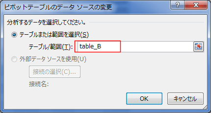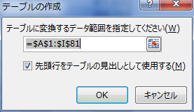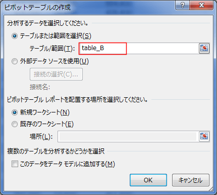 - テーブル/範囲 にテーブル名が入力されます。[OK]ボタンをクリックします。