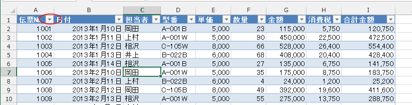 - 先頭行の見出しにフィルターボタンが表示され、テーブルが設定されました。