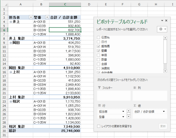 - 下図のようなピボットテーブルを作成しました。