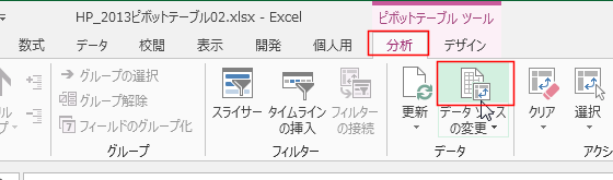 - ピボットテーブルツールの[分析]タブを選択します。