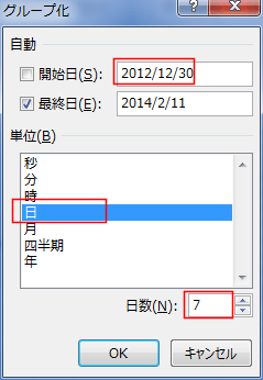 開始日では週の始まりを日曜日にしたいので、2013年1月の第1週の始まりである「2012/12/30」と入力しました。