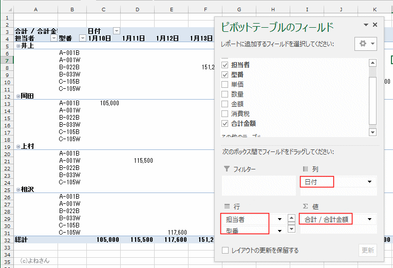 - 作成したピボットテーブルは下図のようにフィールドを設定しています。