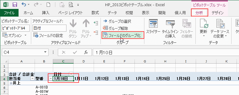 - ピボットテーブルの日付のセルを選択します。
