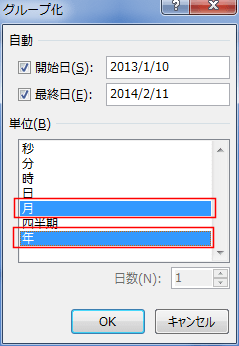1年分のデータの時は「月」だけでもよいことになります。複数年にわたるデータの時は「月」と「年」の両方を選択します。