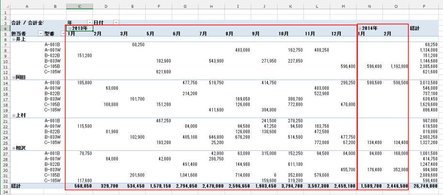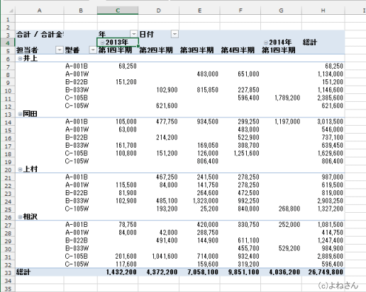 よねさんのExcelとWordの使い方|エクセル2013基本講座:目次|ピボットテーブルとピボットグラフ|ピボットテーブルの日付のグループ化