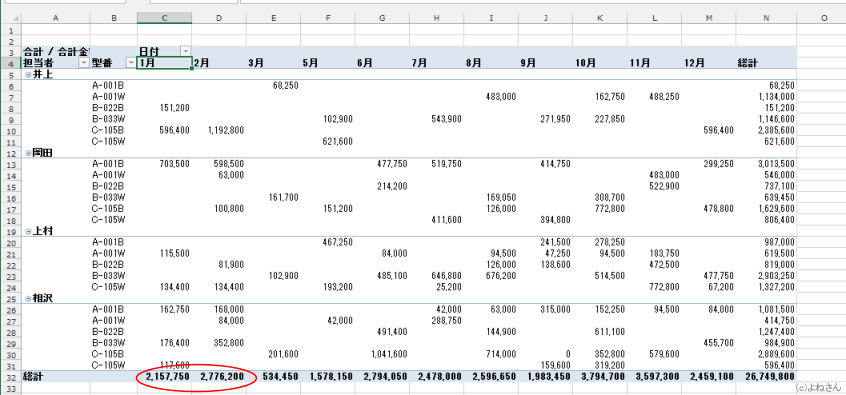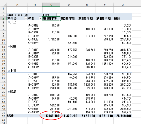 小計は非表示です。総計は行と列を表示しています。